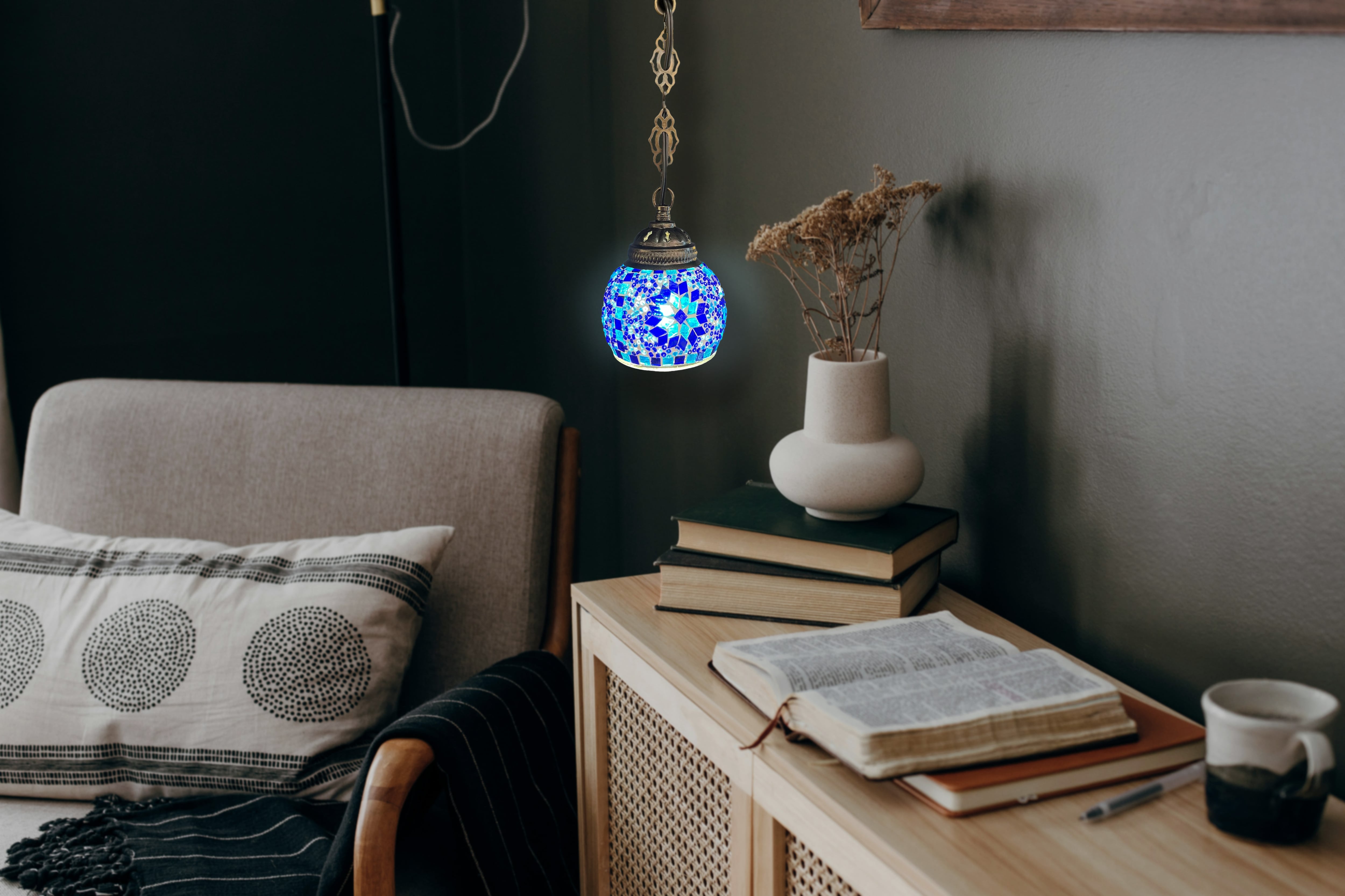 【LED電球付き】天井から吊り下げるシーリング接続型のトルコモザイクランプです。