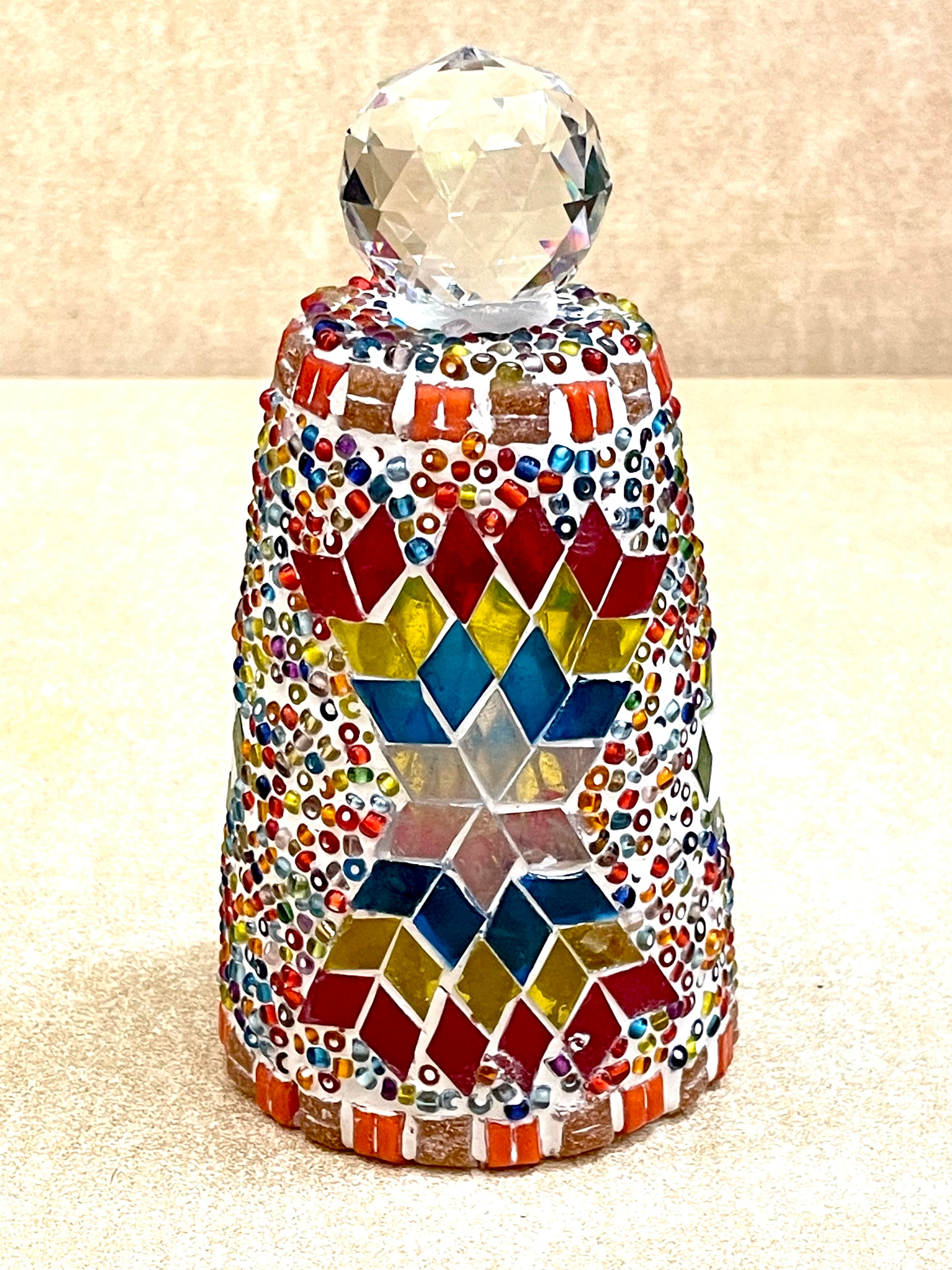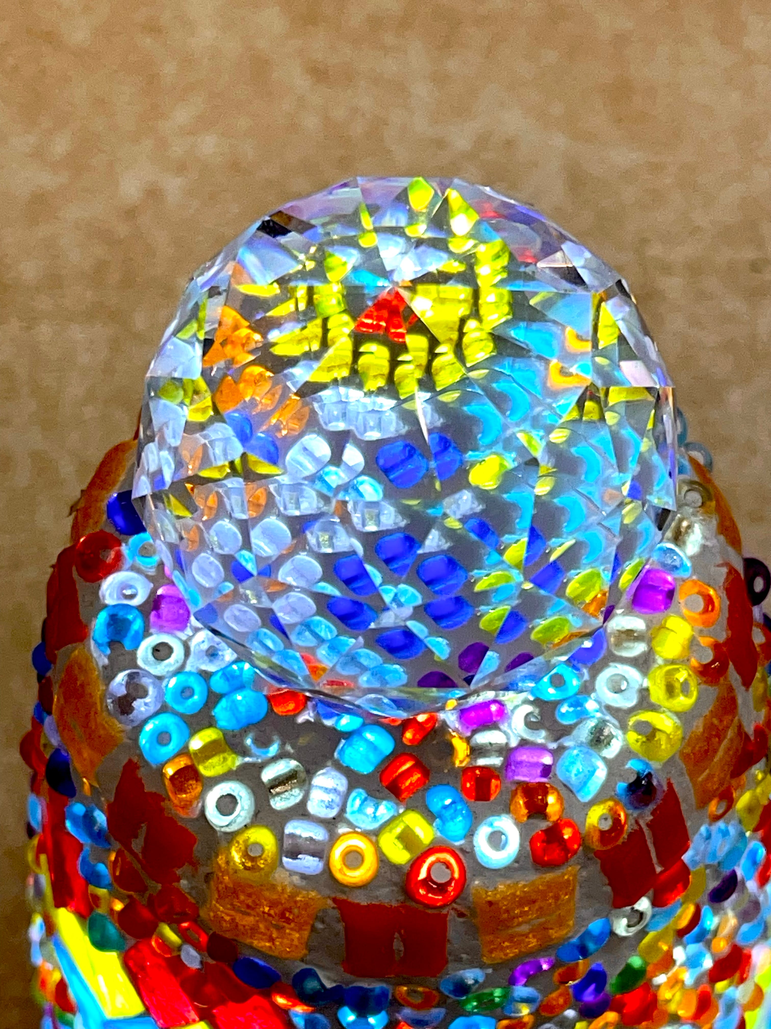 手でカットした板ガラスとビーズを、ガラス球の上に一つづづ手作業で貼り付け、石膏で固めています。