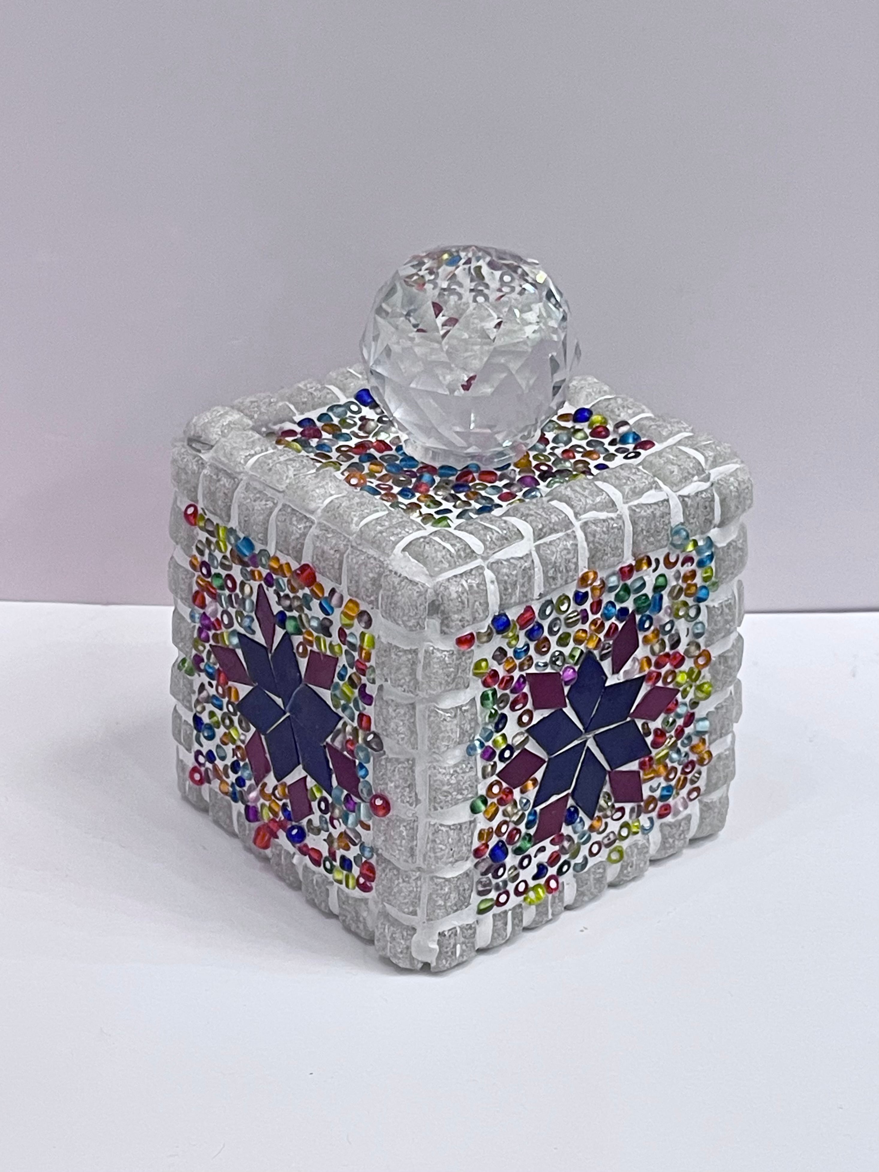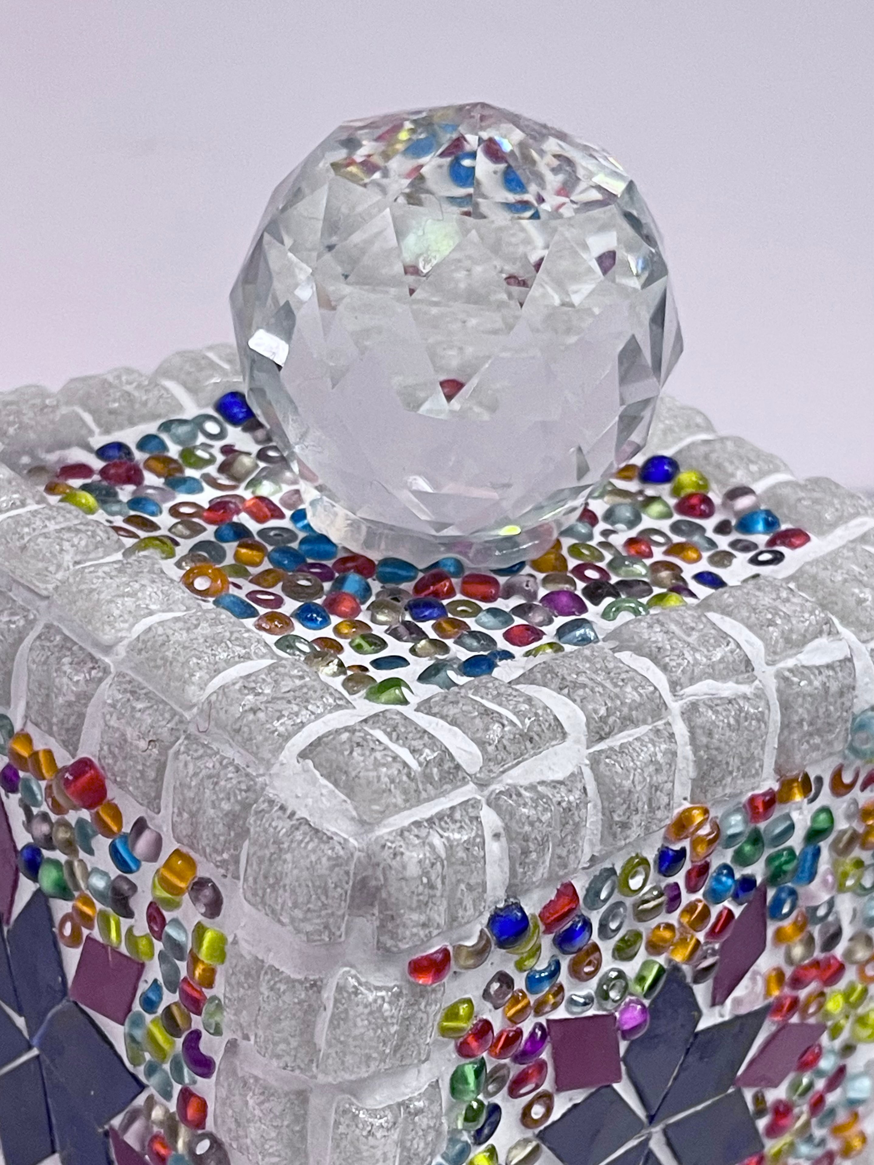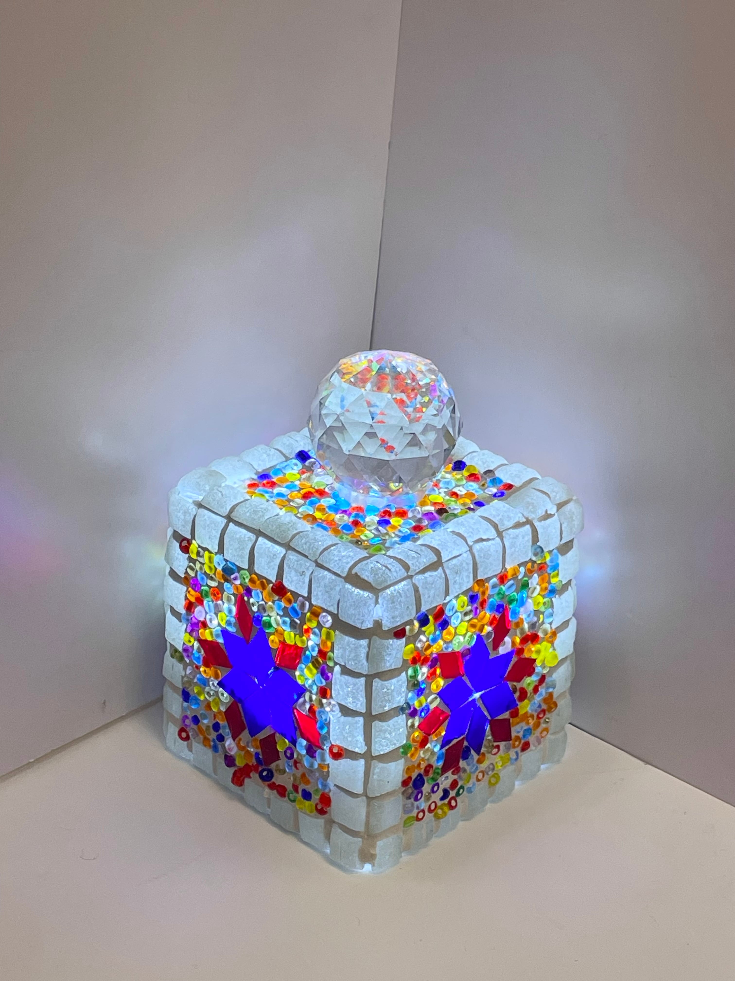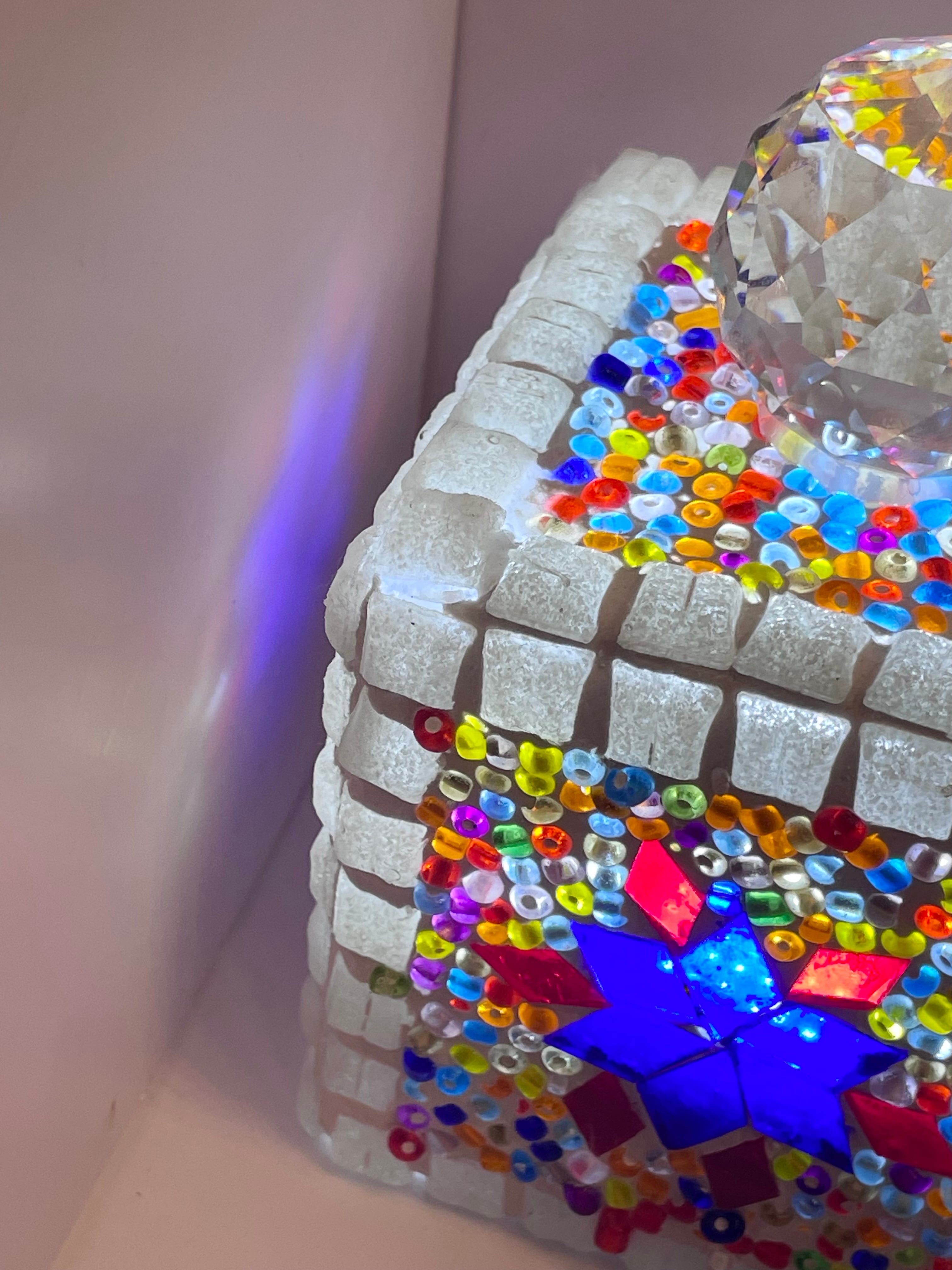 手でカットした板ガラスとビーズを、ガラス球の上に一つづづ手作業で貼り付け、石膏で固めています。