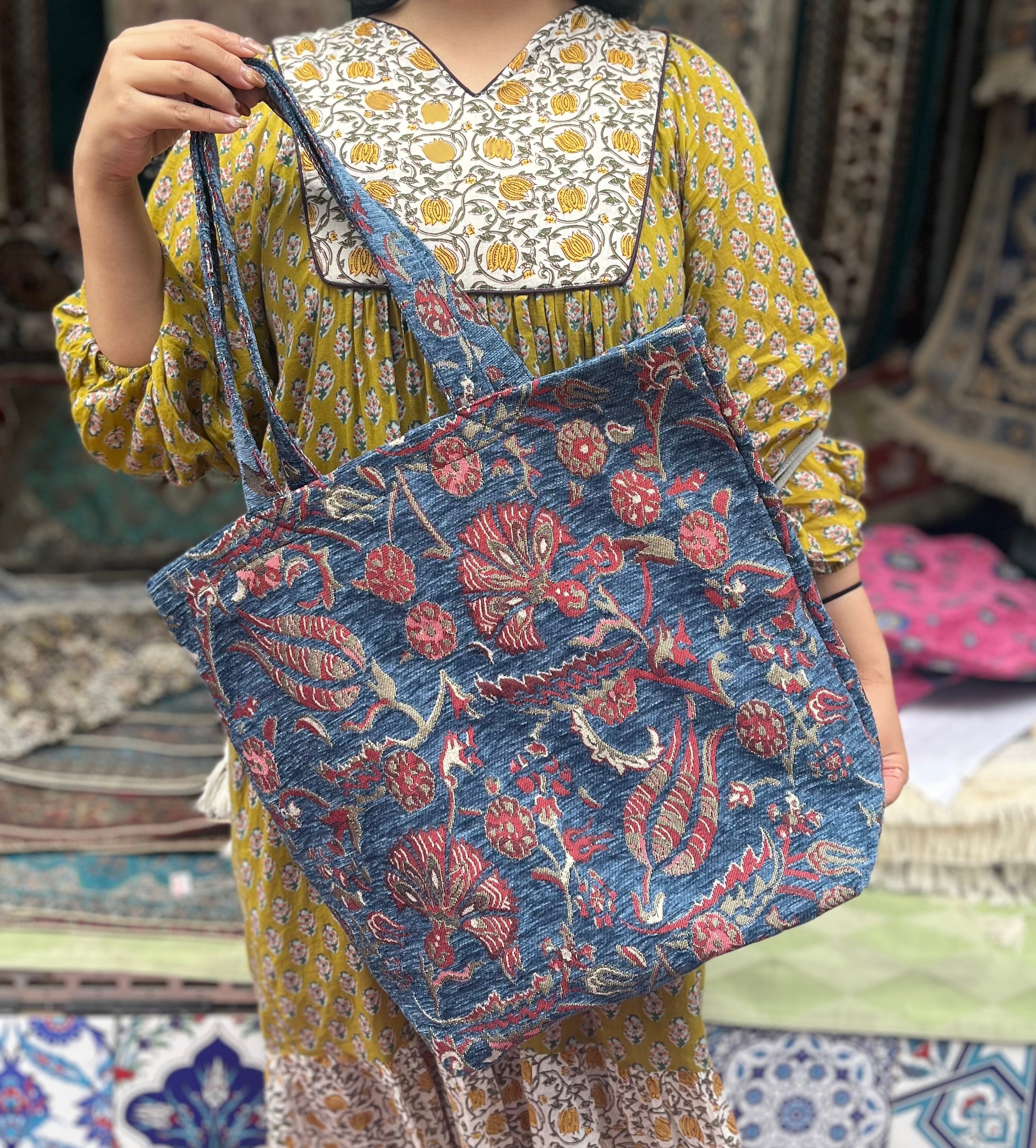 ZAKUROオリジナルトートバッグ大 フラワーくすみ青