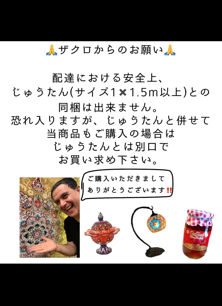 こちらの商品は1×1.5m以上の大きさのじゅうたんとの同梱は出来ません。じゅうたんとランプは別けてお買い求め下さい。