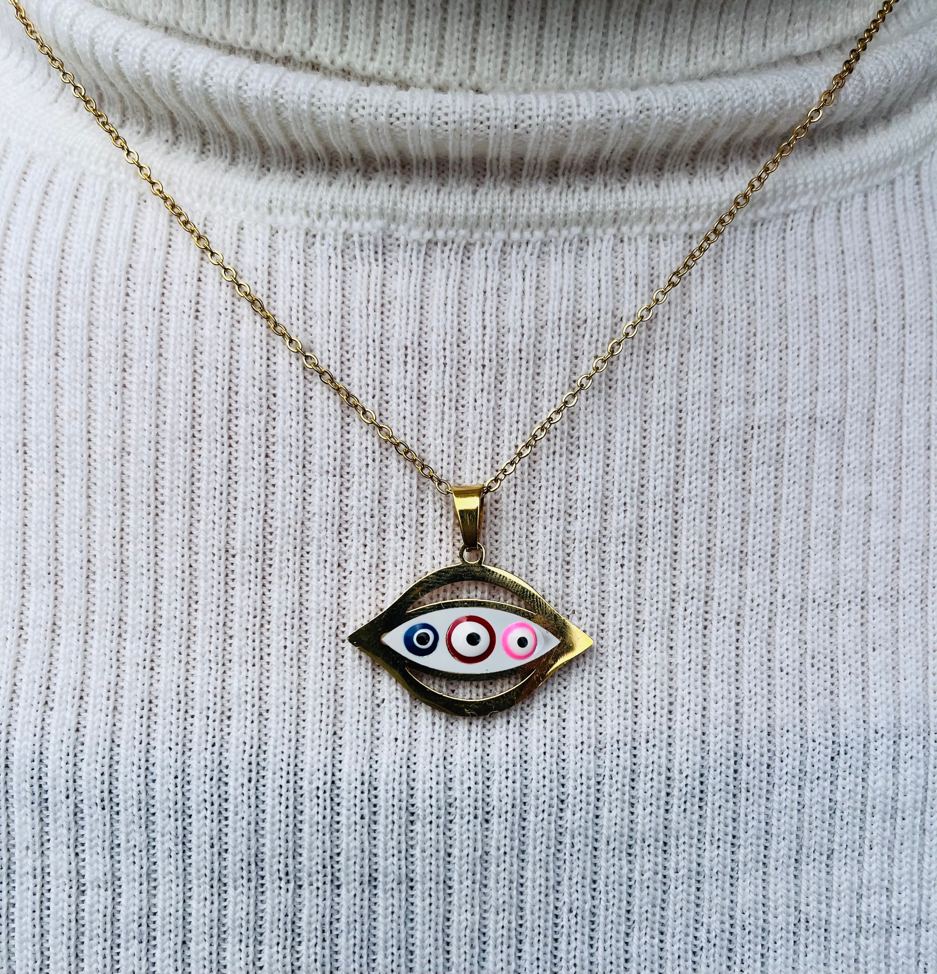 このアクセサリーは、目の形をしたモチーフが特徴です。古代から様々な文化で持たれてきた魔除けのアイテムとして知られ、ネガティブエネルギーから身を守る力を備えています。